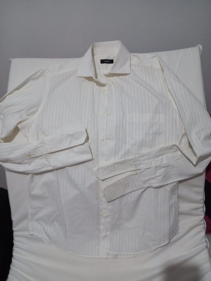 Erkekler için beyaz gömlek, normal kesim, uzun kollu ve yakalıdır. Düğmeli ön kısmı ve hafif çizgili deseni ile ofis ve gündelik sokak tarzına uygundur. Kol manşetleri kol düğmesine uygundur.