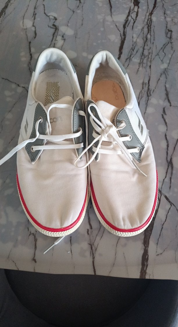 Beyaz ve gri bağcıklı erkek spor ayakkabısı, düz kauçuk tabanlı, günlük sokak stili için rahat ve şık.