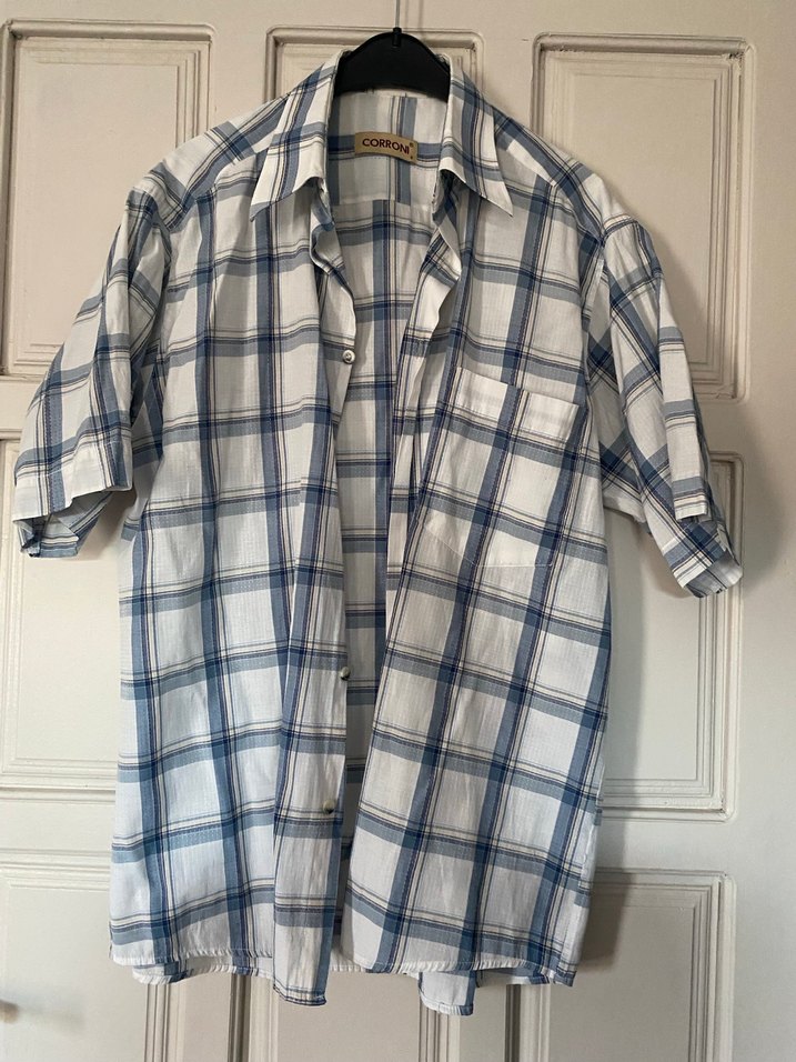 Pamuk kumaştan, düğmeli, kısa kollu, yakalı ve bol kesim erkek gömleği. Gri beyaz kareli desene sahip, günlük sokak stiline uygun.