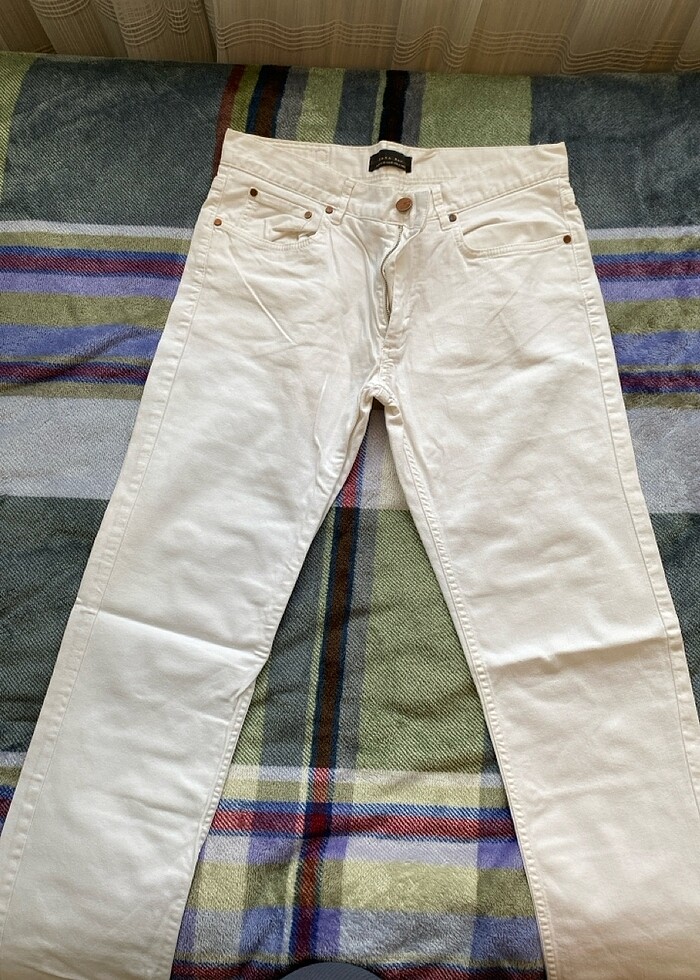 Zara marka, beyaz jean. %1 likralı. Mezura ölçüleri fotoğrafta var. Oldukça iyi durumda.1-2 kez giyildi . Düz paça. Slim fit