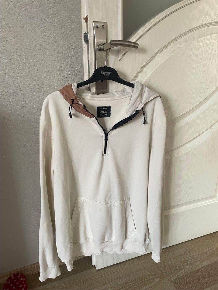 Bol kesim, beyaz kapüşonlu sweatshirt, uzun kollu ve fermuarlı ön kısmı ile. Yumuşak ve sıcak kumaştan, gündelik kullanım için uygundur.