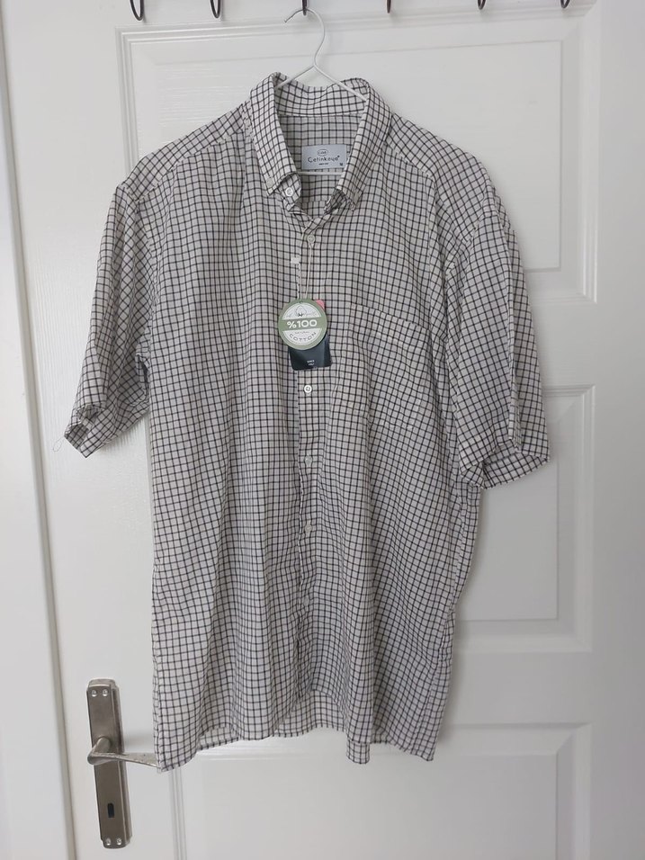 Erkekler için beyaz, kare desenli, kısa kollu, pamuk kumaştan, düğmeli ve yakalı gömlek. Rahat ve bol kesimiyle günlük sokak tarzına uygundur.