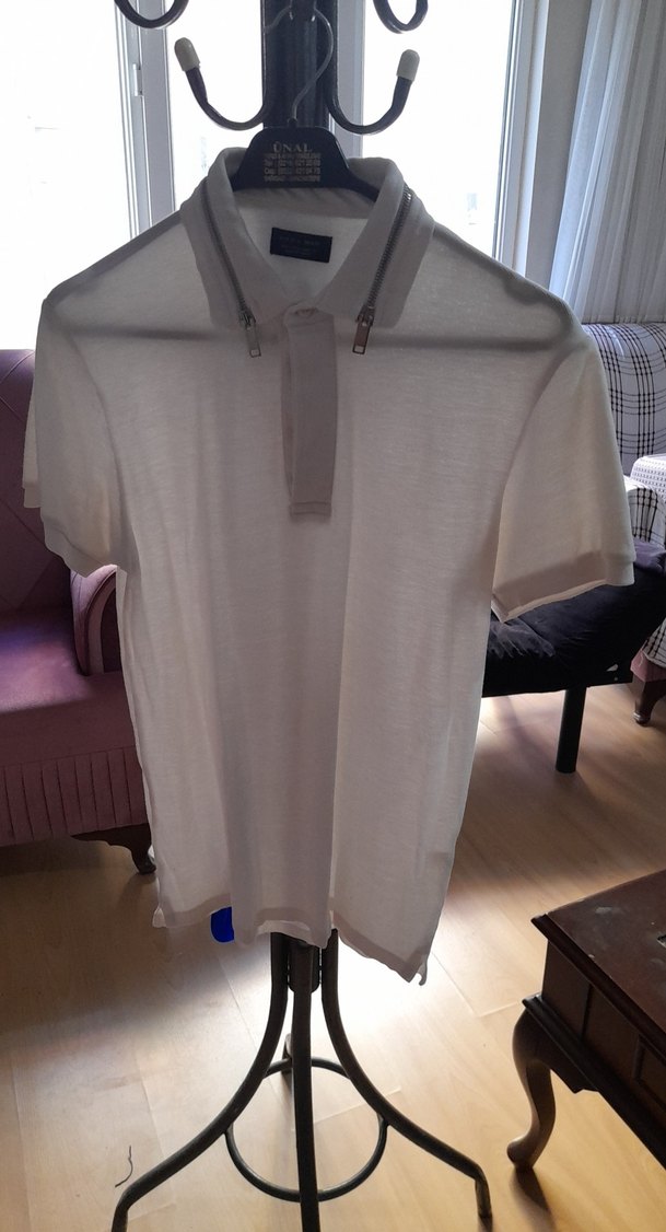 Beyaz renkli, yakalı ve kısa kollu erkek polo tişörtü. Kemer detayı bulunan, sentetik kumaştan üretilmiş, günlük kullanım için uygun.