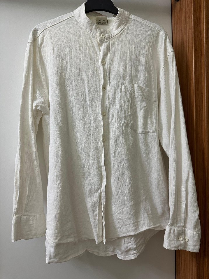 Erkekler için beyaz keten gömlek, uzun kollu ve düğmeli. Bohem tarzda, salaş kesim ve sade tasarıma sahip, günlük kullanıma uygun.