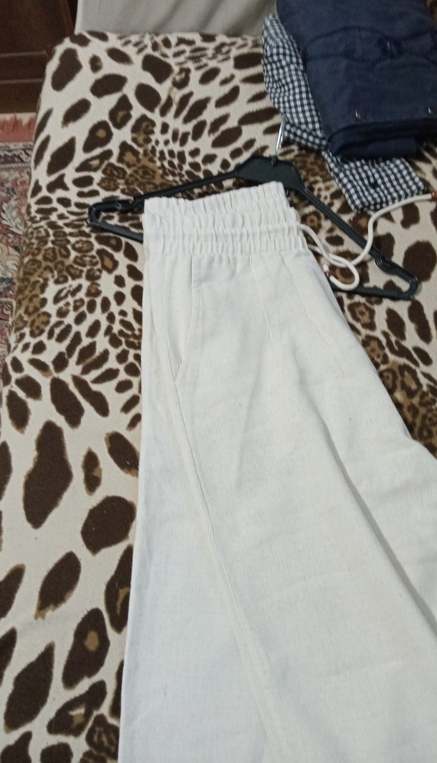 Beyaz keten, bol kesim, uzun paça kadın pantolon. Rahat sokak stili ve hafif zebra desen detaylarıyla günlük kullanıma uygun.