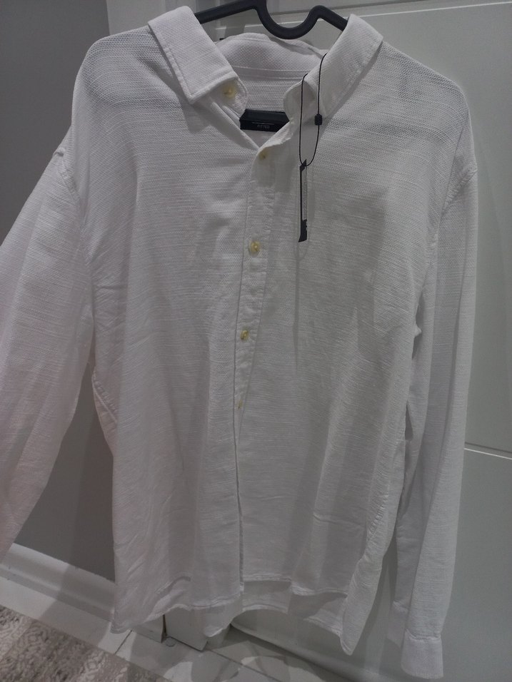Erkek beyaz keten gömlek, yakalı ve uzun kollu, düğmeli ve bol kesimdir. Desensiz ve sade tasarımıyla günlük rahat sokak stiline uygundur. fit gömlek