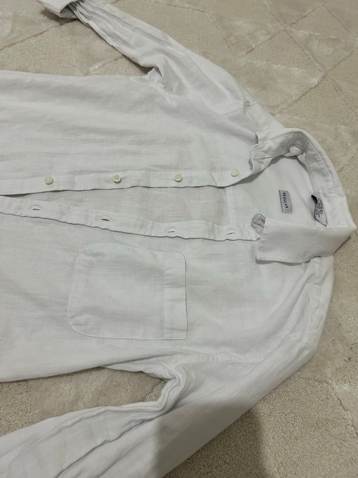 Beyaz keten erkek gömlek, düğmeli, uzun kollu ve yakalıdır. Tek cep ve bol kesimiyle minimalist tasarıma sahiptir, günlük kullanım için uygundur.