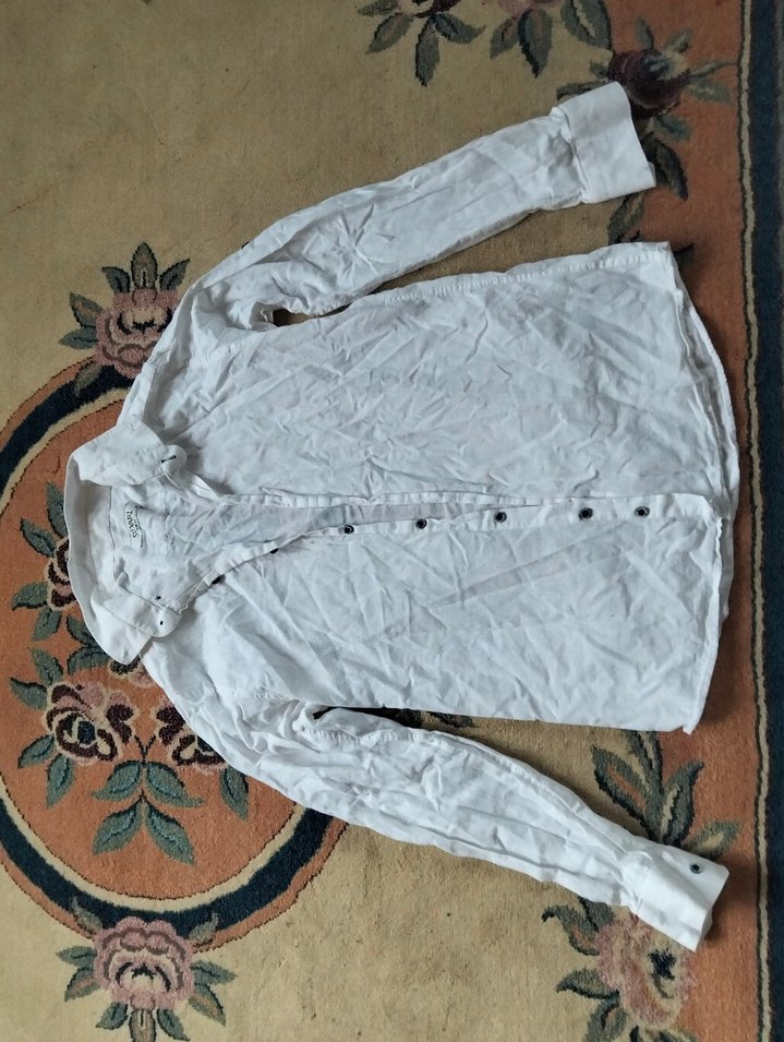 Erkekler için beyaz keten gömlek, uzun kollu ve yakalıdır. Düğmeli ön kısmı ve bol kesimiyle günlük rahat kullanıma uygundur.