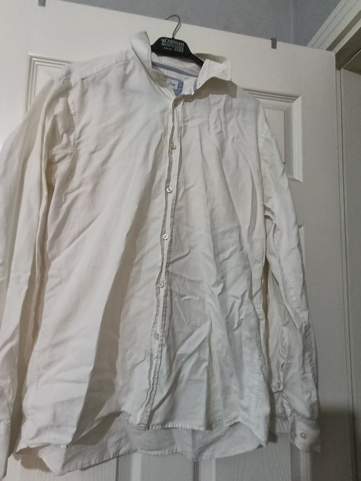 Beyaz keten gömlek, uzun kollu ve yakalıdır. Düğmeli ön kısmı ve bol kesimi ile ofis kullanımı için uygundur.
