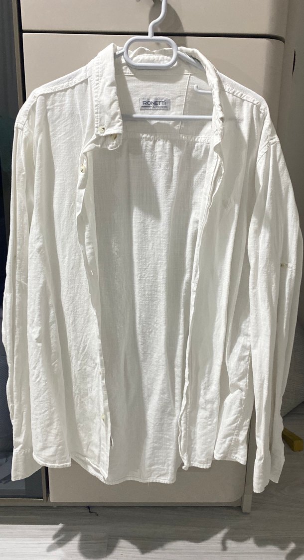 Erkekler için beyaz keten gömlek, uzun kollu, yakalı ve düğmeli. Bol kesim ve normal uzunlukta, günlük kullanım için uygundur.