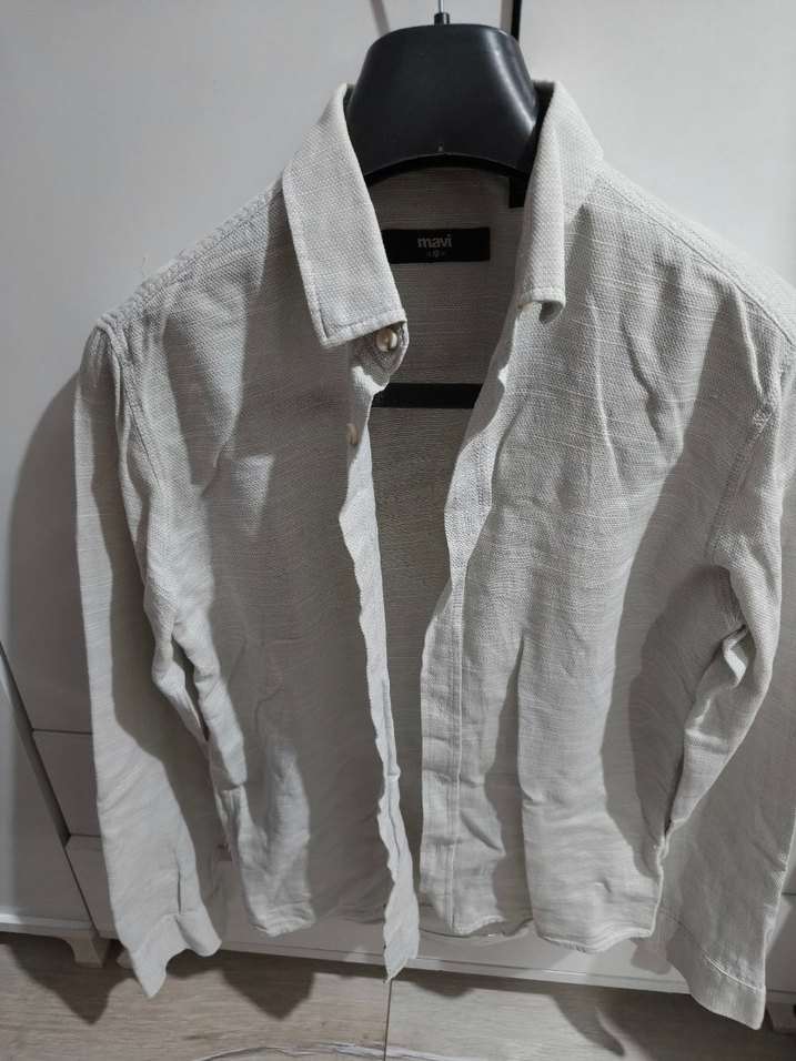 Beyaz keten erkek gömlek, düğmeli ön ve çentikli yaka detayına sahip. Uzun kollu ve regular fit tasarımıyla günlük sokak stiline uygundur.