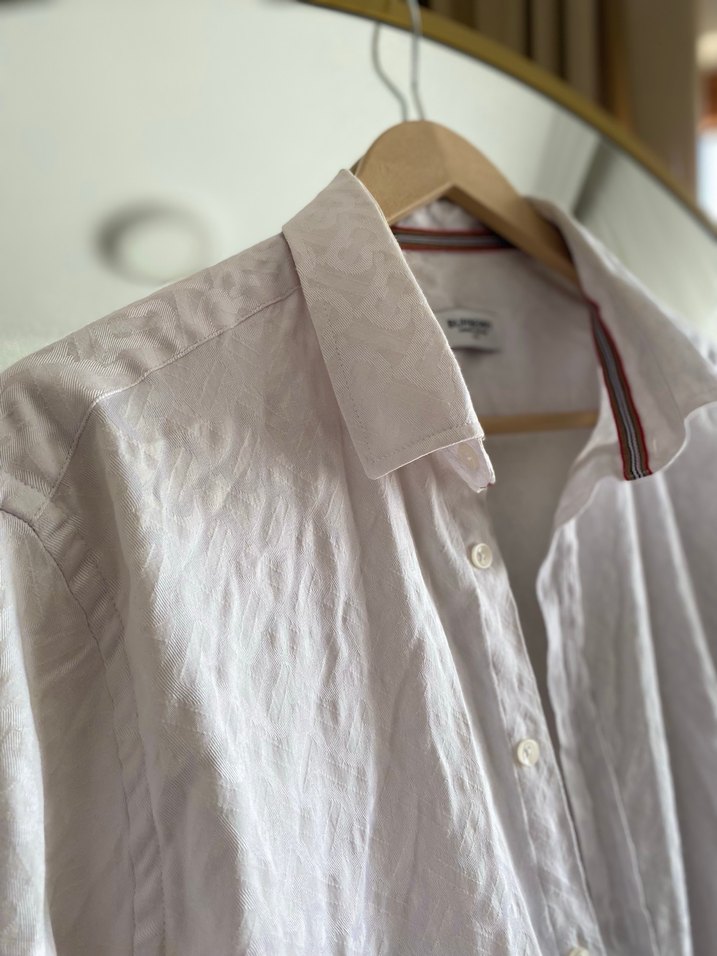 Düğmeli, yakalı ve kısa kollu beyaz keten erkek gömleği, ofis kullanımı için uygun regular kesim sunar. Parlak kumaşı minimal tasarıma hafif doku katar.