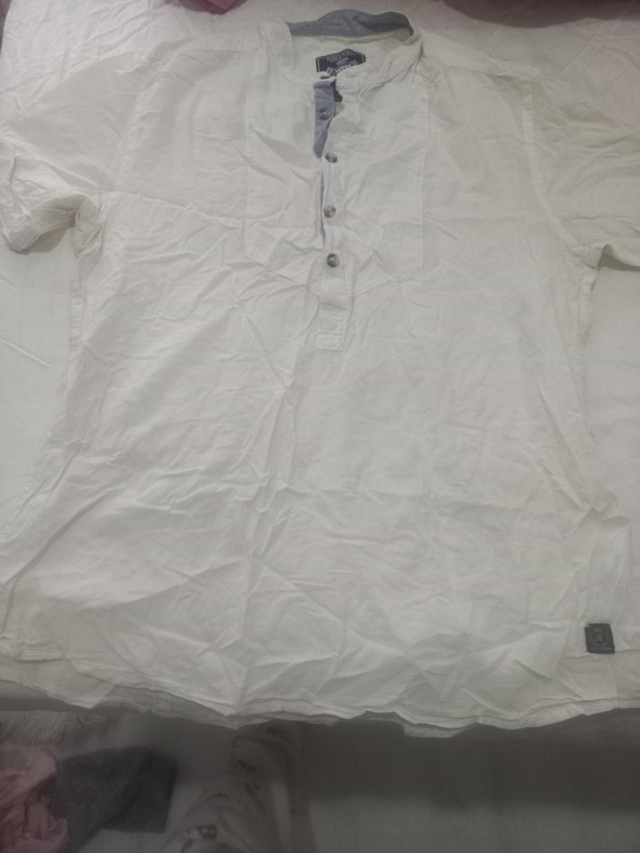 Beyaz keten kumaştan, kısa kollu ve yakalı erkek gömleği. Düğmeli ön kısmı ve bol kesimiyle günlük rahat kullanıma uygundur.