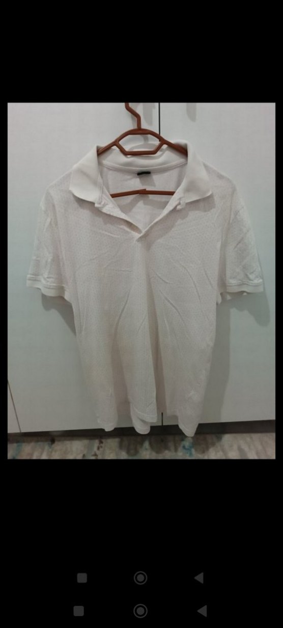 Beyaz keten erkek polo tişört, yakalı ve kısa kollu, rahat kesimiyle günlük sokak stiline uygun.