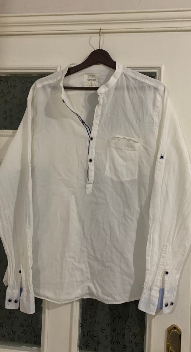 Erkekler için bol kesim, uzun kollu beyaz keten gömlek. Yaka kısmı düğmeli ve günlük kullanıma uygundur.