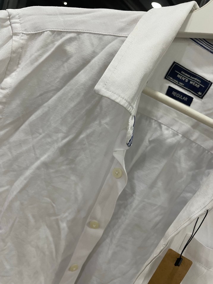 Beyaz keten, yakalı ve düğmeli erkek gömleği. Kısa kollu, normal kesim ve desen içermeyen minimalist tasarıma sahip, günlük kullanım için uygun.
