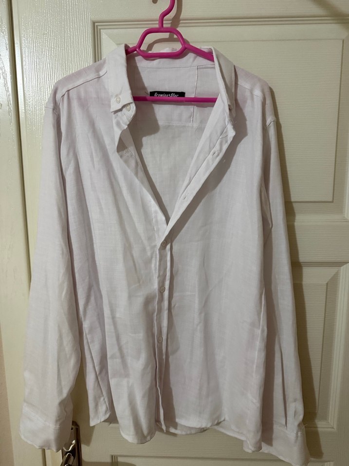Bu erkek beyaz keten gömlek, yakalı ve düğmeli uzun kolludur. Normal uzunlukta ve regular fit olup, gündelik ve ofis tarzına uygundur. Desensiz ve hafif dokuludur.