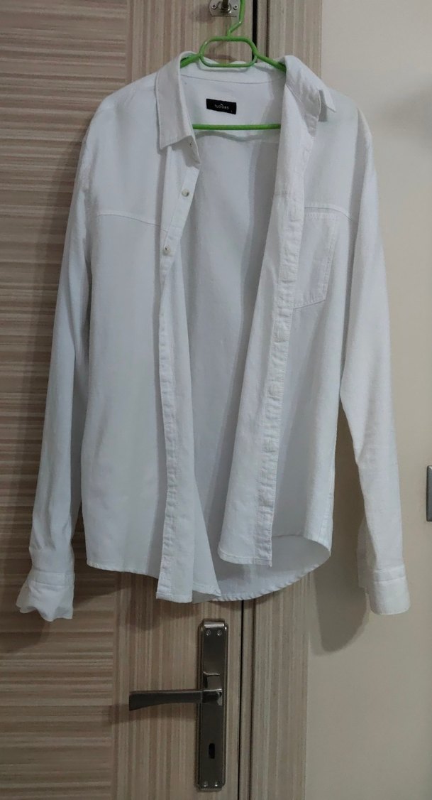 Erkekler için beyaz keten gömlek, uzun kollu ve yakalıdır. Düğmeli ön kısmı, normal boyu ve rahat kesimiyle günlük sokak stiline uygundur.