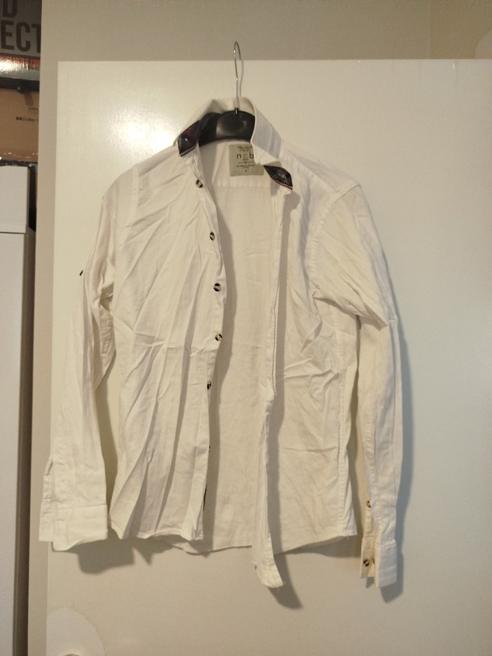 Erkekler için beyaz keten kumaştan, düğmeli ve yakalı uzun kollu gömlek. Normal boyda ve regular fit, minimal ve günlük kullanım için uygundur.