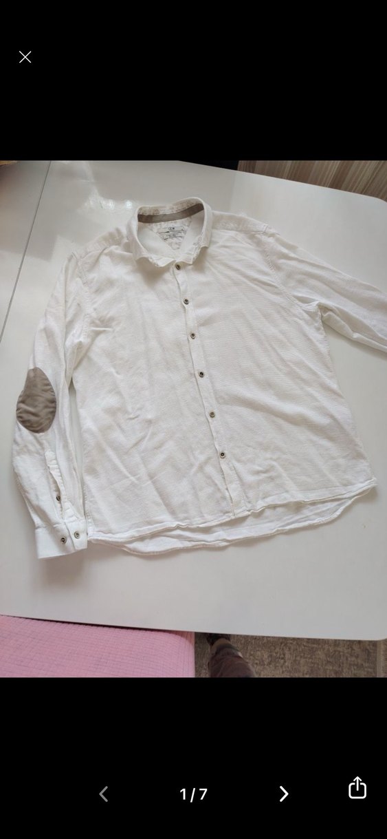 Uzun kollu, düğmeli beyaz keten erkek gömleği. Gri dirsek detayları ve yakalı tasarımıyla rahat ve gündelik kullanım için uygundur.