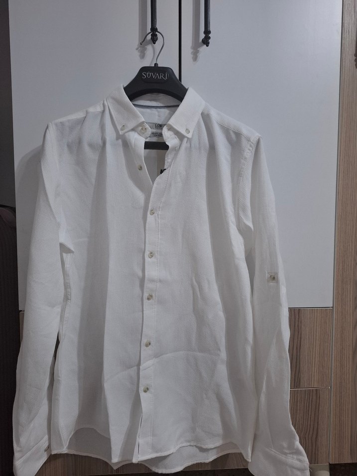 Erkekler için beyaz keten gömlek, yakalı ve düğmeli. Uzun kollu, regular fit, günlük rahat sokak stili için uygundur. Desensiz ve normal boyda.