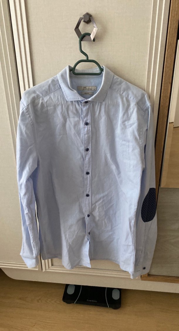 Erkekler için, düğmeli, yakalı, keten kumaştan uzun kollu beyaz gömlek. Dirseklerinde detaylı, rahat kesim, günlük sokak stili için uygun.