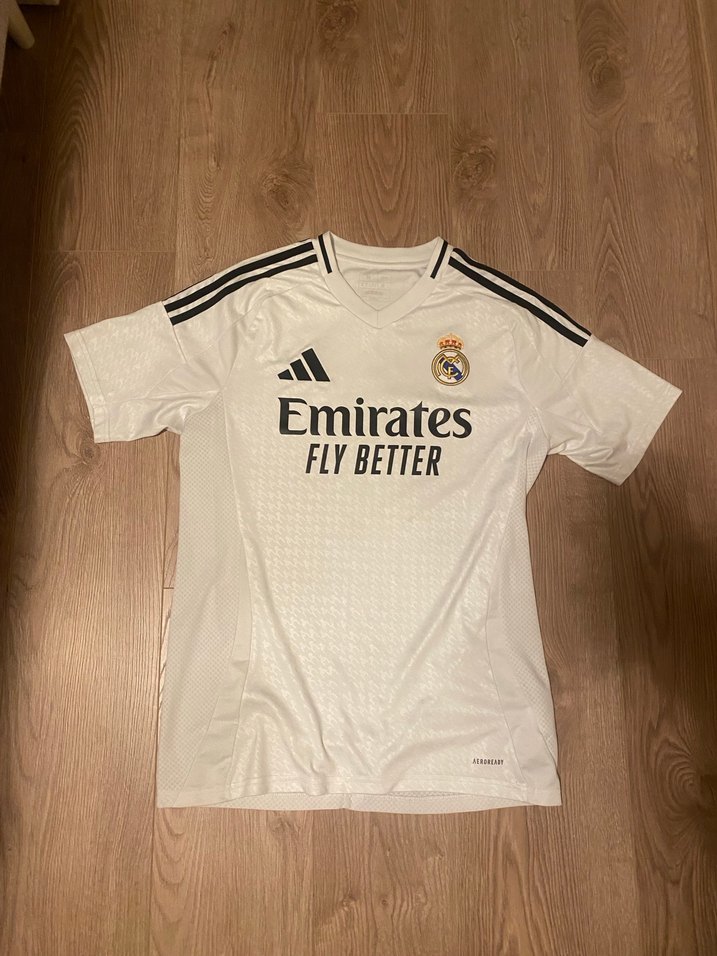 Erkekler için bol kesim, kısa kollu ve yuvarlak yakalı beyaz futbol forması. 'Emirates FLYBETTER' baskılı, hafif sentetik kumaştan, spor ve sokak stiline uygun. ⚽