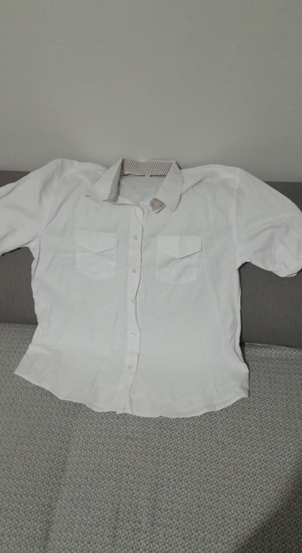 Kısa kollu, yakalı ve düğmeli beyaz keten gömlek. Rahat kesimi ve iki göğüs cebine sahip, gündelik sokak stili için uygun.