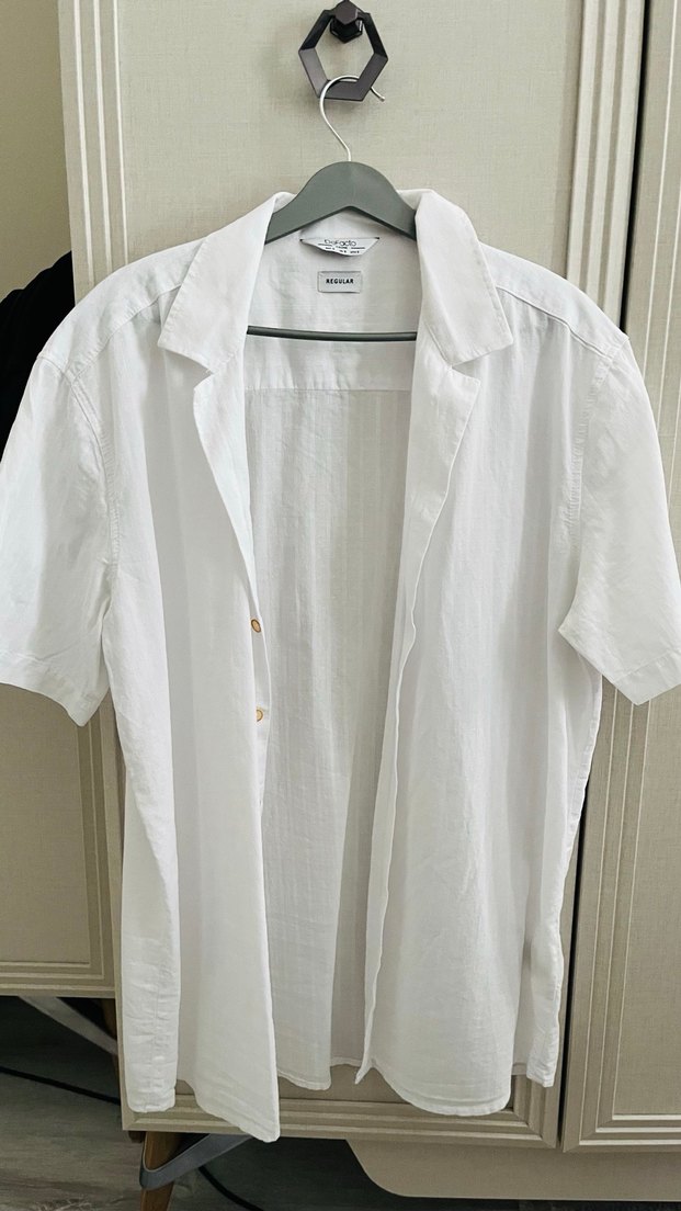 Nefes alabilen keten kumaştan yapılmış, kısa kollu beyaz erkek gömlek. Düğmeli, yakalı ve bol kesimdir, günlük sokak stiline uygundur.