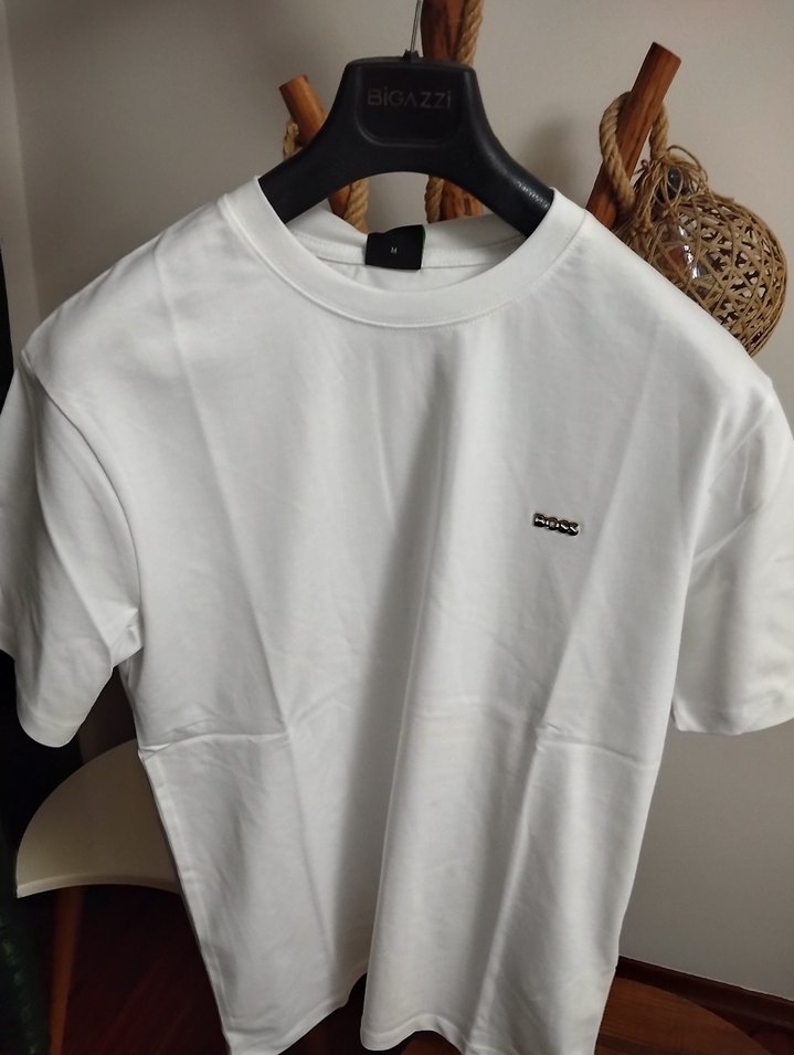 Beyaz kısa kollu, yuvarlak yakalı pamuklu tişört, bol kesim ve küçük logo detayı ile günlük rahat kullanım için uygundur.
