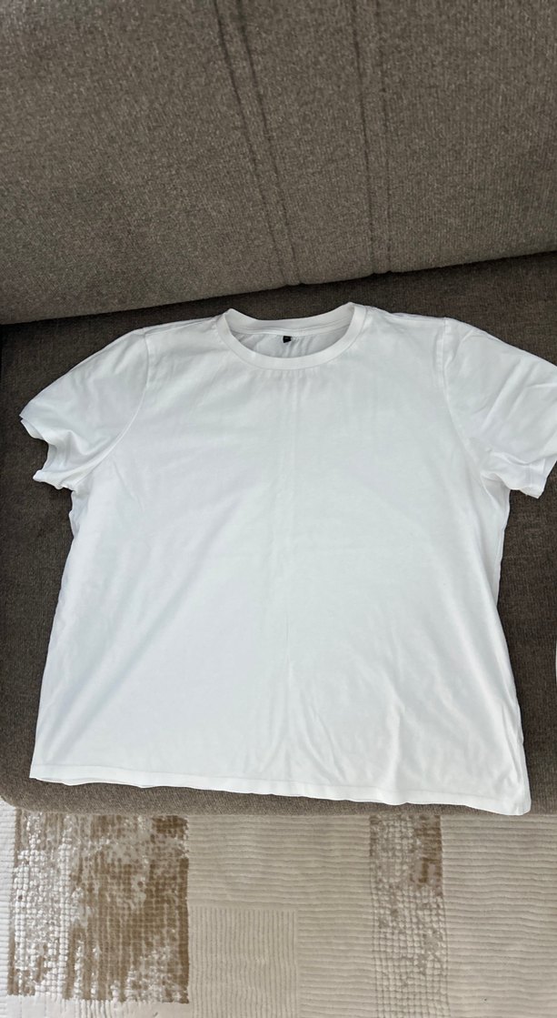 Kadın beyaz tişört, kısa kollu ve yuvarlak yakalıdır. Pamuklu, rahat ve salaş kesimdir, sade ve minimalist tarzda günlük kullanıma uygundur.