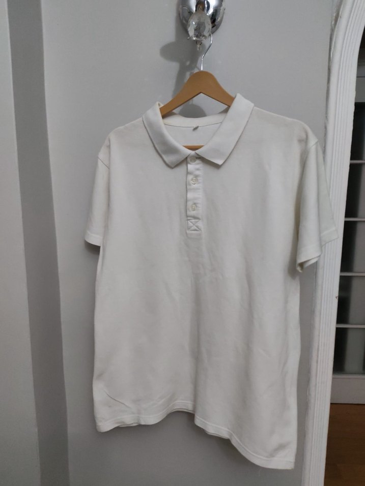 Erkek beyaz polo tişört, kısa kollu ve yakalıdır. Pamuk kumaştan üretilmiş, rahat ve salaş kesimdir. Günlük kullanıma uygundur.