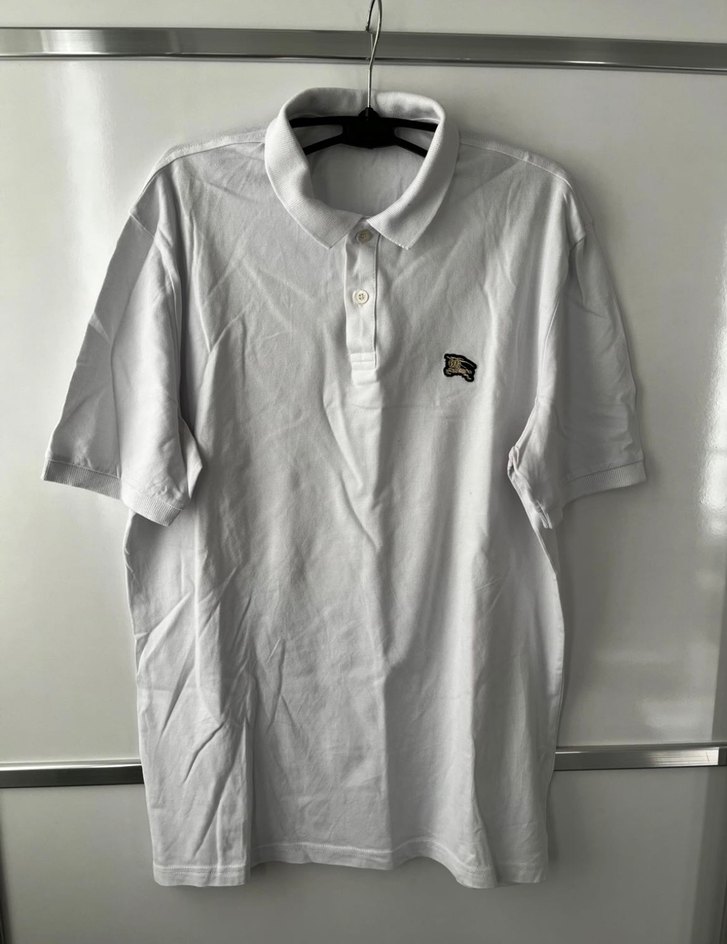 Erkek beyaz polo tişört, kısa kollu ve düğmeli yakaya sahiptir.