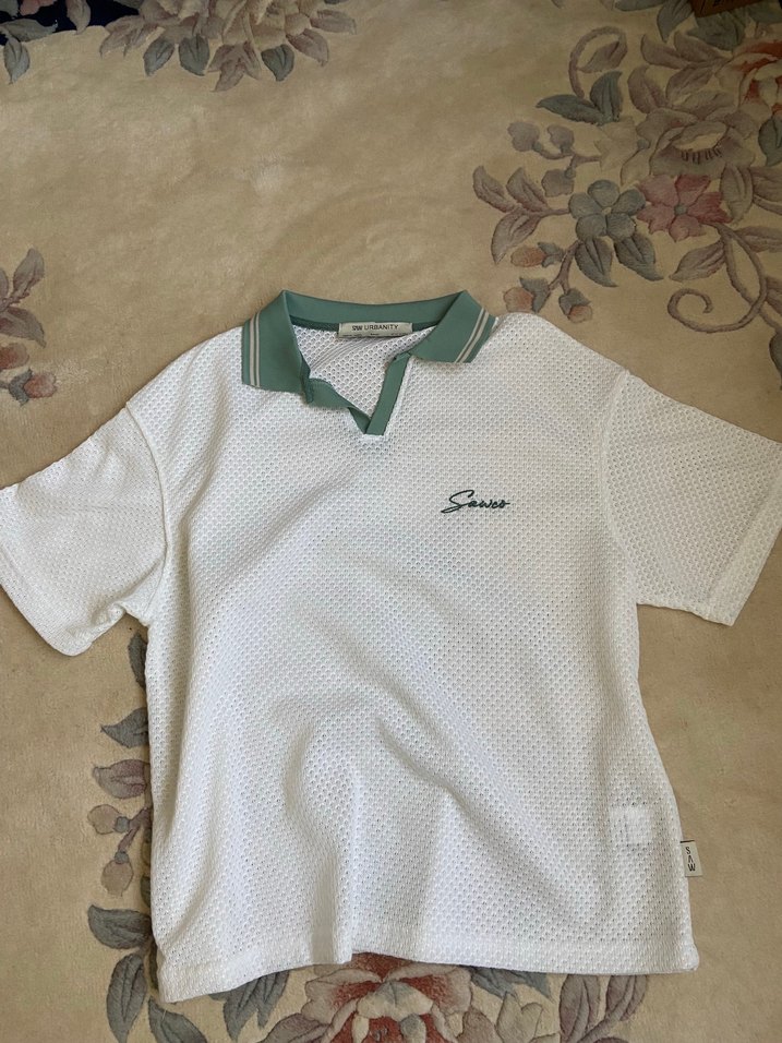 Pamuk kumaştan, pastel yeşil detaylı yakalı ve baskılı logolu beyaz erkek polo tişört. Rahat kesim ve kısa kollu, günlük kullanım için uygundur. ️