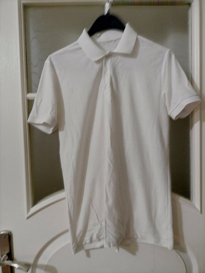 Erkek beyaz polo tişört, kısa kollu ve yakalıdır. Pamuklu kumaştan üretilmiş, günlük rahat kullanım için uygundur.