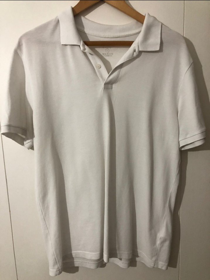 Erkekler için beyaz polo tişört, kısa kollu ve yakalıdır. Yumuşak pamuk kumaştan, günlük kullanıma uygun, minimalist ve sade tasarımlıdır.