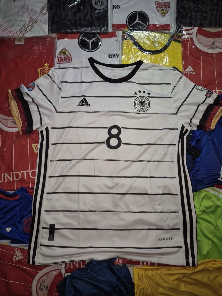 Beyaz, kısa kollu, yuvarlak yakalı, dar kesim erkek spor forması. Sentetik kumaş, baskılı desen ve cırt cırt detaylı, athleisure ve sokak tarzına uygun. ⚽