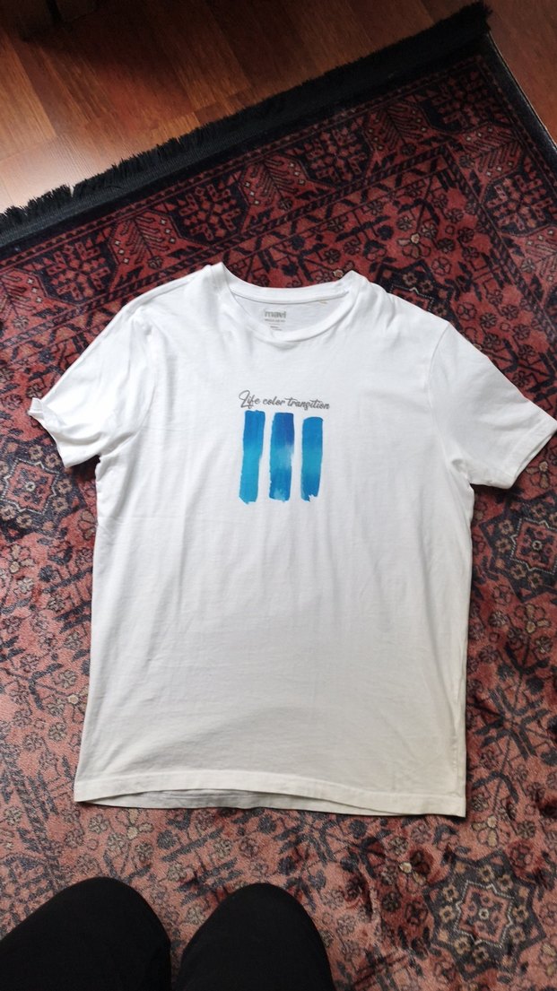 Pamuklu, beyaz renkli, oversize kesim ve bisiklet yaka olan erkek tişörtü, önde mavi tie-dye desenle sade bir görünüm sunar. Günlük kullanıma uygundur.