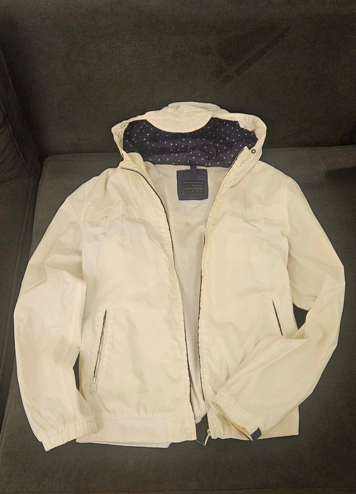 Erkek beyaz midi boy kapüşonlu yağmurluk, bol kesim, uzun kollu ve fermuarlı. Sentetik kumaştan, günlük açık hava kullanımı için uygundur. ️