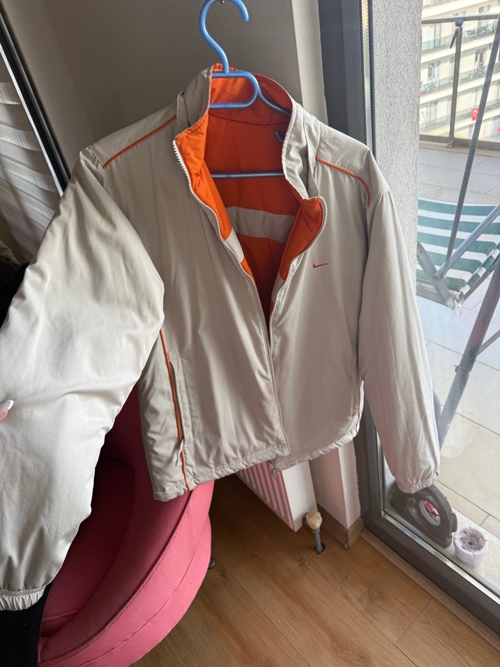 Erkekler için beyaz midi yağmurluk, yüksek yakalı, uzun kollu ve bol kesimdir. Fermuarlı ve sentetik kumaştan yapılmıştır, günlük kullanıma uygundur. ️Çift taraflı Vintage Nike