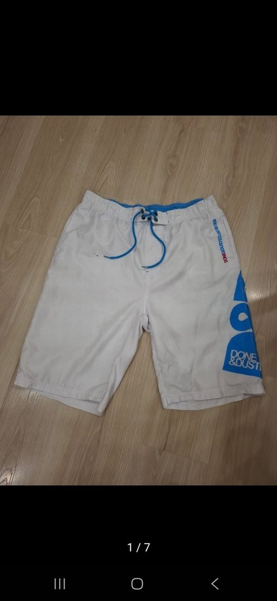 Beyaz, bol kesim erkek mini şort, baskılı desen ve kemer detaylıdır. Ayarlanabilir açık mavi bağcık bulunur. Plaj ve sokak stiline uygundur.