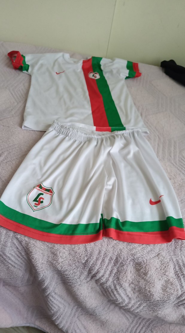 Erkek beyaz mini spor takımı, kısa kollu, bol kesim tişört ve şorttan oluşur. Yeşil ve kırmızı baskılı çizgiler ve bağcıklı detaylar bulunur. ⚽