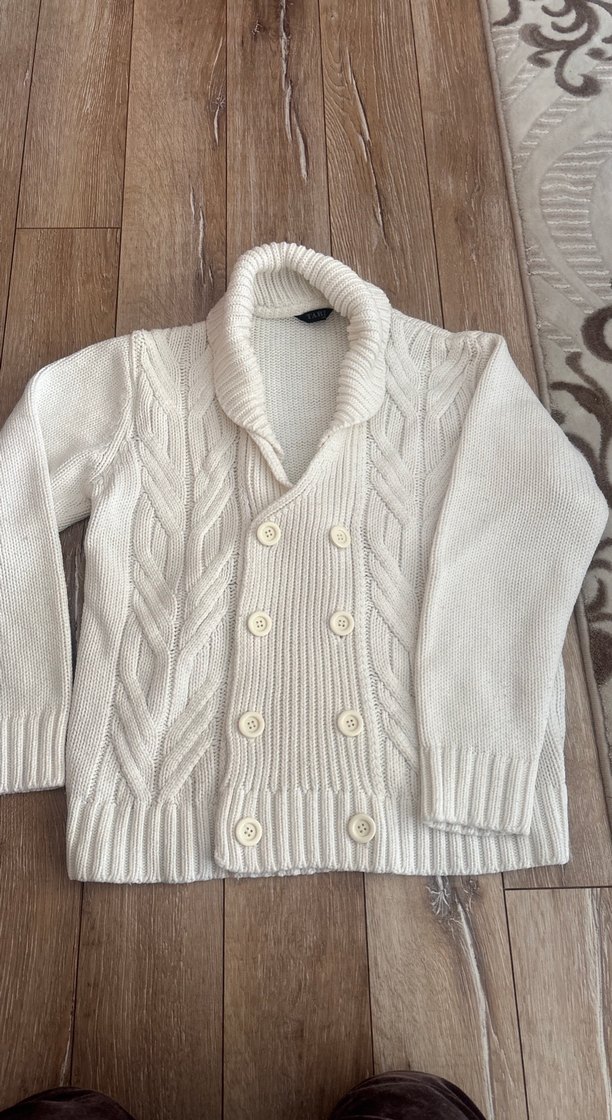 Beyaz örgü kumaştan, uzun kollu ve çift sıra düğmeli erkek hırka, rahat kesim ve sokak tarzına uygun.
