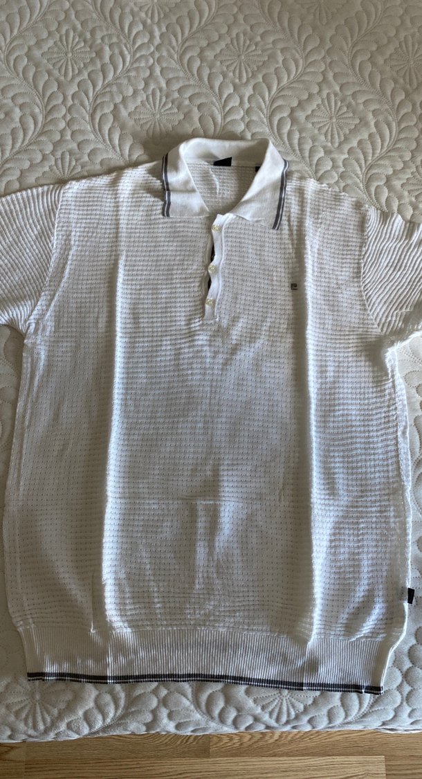 Örgü dokulu, yakalı beyaz erkek polo tişört, kısa kollu ve bol kesim. Gündelik sokak stiline uygun, normal uzunlukta ve gri detaylıdır.