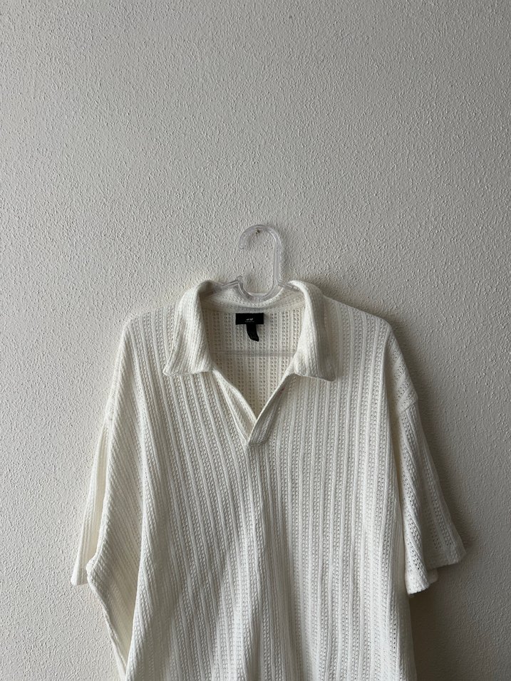 Örgü dokulu, yakalı ve kısa kollu erkek beyaz polo tişört. Bol kesim ve normal boyda, günlük kullanıma uygun minimalist ve trend sokak stili.