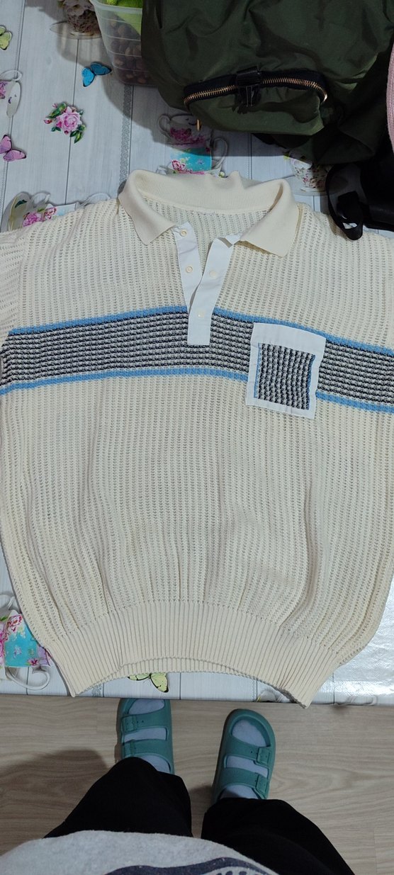 Erkekler için örme triko, gevşek kesim, kısa kollu ve yuvarlak yaka. Beyaz renkli, pastel çizgili ve küçük cep detaylı, günlük sokak stili için uygundur.