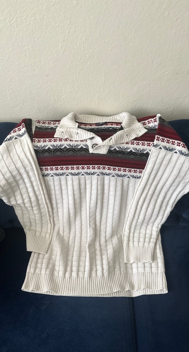Bu erkek beyaz kazak, yakalı ve uzun kolludur. Gri ve kırmızı desen detaylarıyla örgü kumaştan, rahat ve sokak stili uyumlu tasarlanmıştır. İki koltuk arası 50 cm