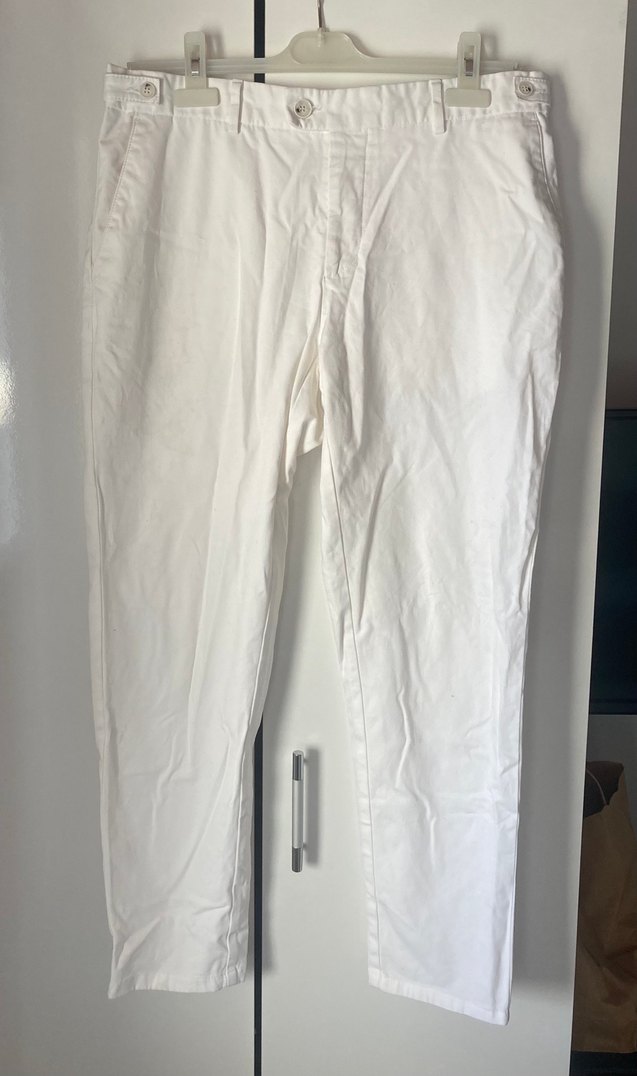 Erkekler için beyaz pamuk kumaş pantolon, regular fit. Minimalist ve normcore tarzıyla ofis kullanımı için uygundur. Hiç kullanılmadı.