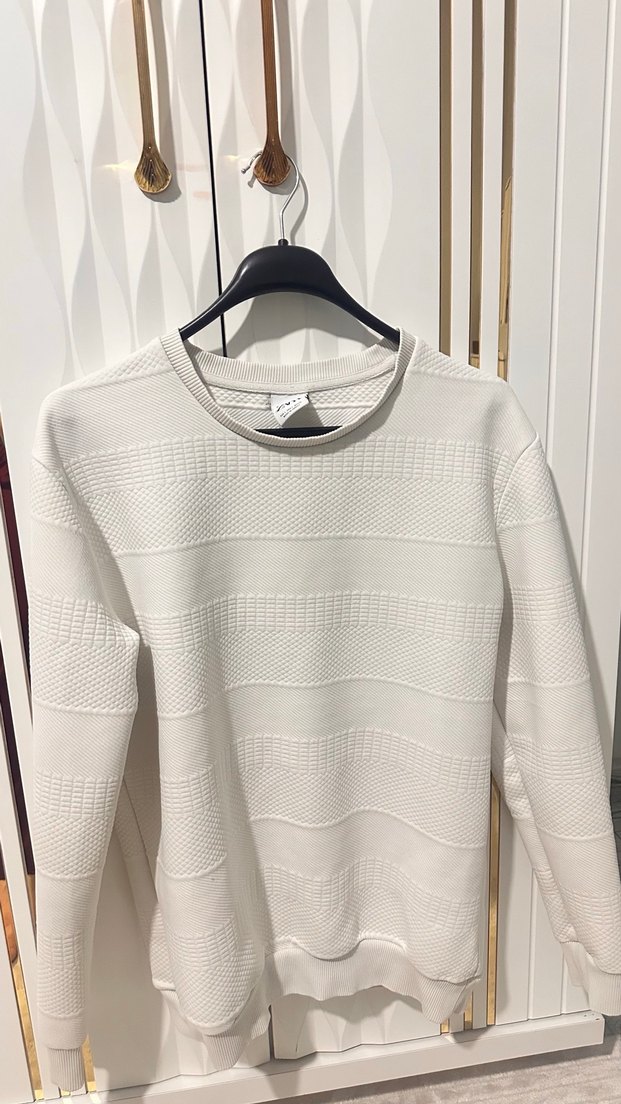 Erkekler için bisiklet yaka ve uzun kollu, pamuktan örülmüş bir kazak. Gri beyaz tonlarında, rahat kesimli ve desen içermeyen, günlük sokak tarzına uygun bir model.