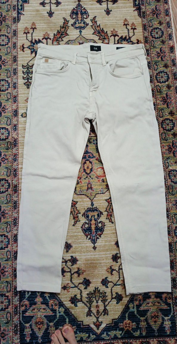 Erkekler için düzenli kesim, pamuklu kumaştan yapılmış beyaz renkli kemerli pantolon. Günlük kullanıma uygun, desen içermeyen sade tasarım.